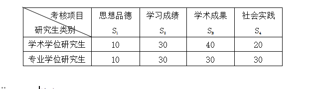 研究生学业奖学金评定应综合考虑“思想品德”、“学习成绩”、“学术成果”和“社会实践”等四个方面的表现,各考核项目参考权重标准如表2所示。