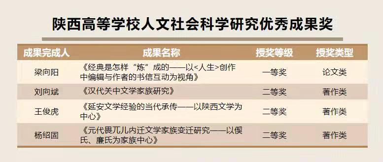 (本网讯)10月30日,陕西省教育厅公布了2021年度陕西高等学校人文社会科学研究优秀成果奖获奖名单,我院梁向阳教授、刘向斌教授、王俊虎教授、杨绍固副教授4位教师的论文与著作获奖。其中,梁向阳教授的学术论文《经典是怎样“炼”成的——以<人生>创作中编辑与作者的书信互动为视角》获得论文类一等奖,刘向斌教授的学术专著《汉代关中文学家族研究》、王俊虎教授的学术专著《延安文学经验的当代承传——以陕西文学为中心》、杨绍固副教授的学术专著《元代畏兀儿内迁文学家族变迁研究——以偰氏、廉氏为家族中心》获得著作类二等奖。我院教师在此次评奖活动中喜获论文类一等奖1项,著作类二等奖3项,获奖等级与数量均居全校各文科院系前列。