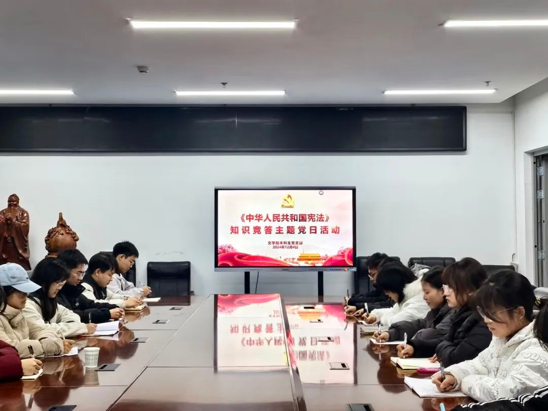 (本网讯)在全国第十一个“国家宪法日”暨第七个“宪法宣传周”来临之际,为深入贯彻习近平法治思想,扎实推进宪法知识的普及工作,大力弘扬宪法精神,切实提升全体师生的法治观念与宪法意识,积极营造尊法、学法、守法、用法的浓厚法治文化氛围,我院党委于12月4日晚7点在文学楼408会议室开展宪法知识竞答主题党日活动。参加此次活动的人员有文学院本科生党支部书记张伟平及本科生党支部全体成员,本次活动由黄奕同学主持。
