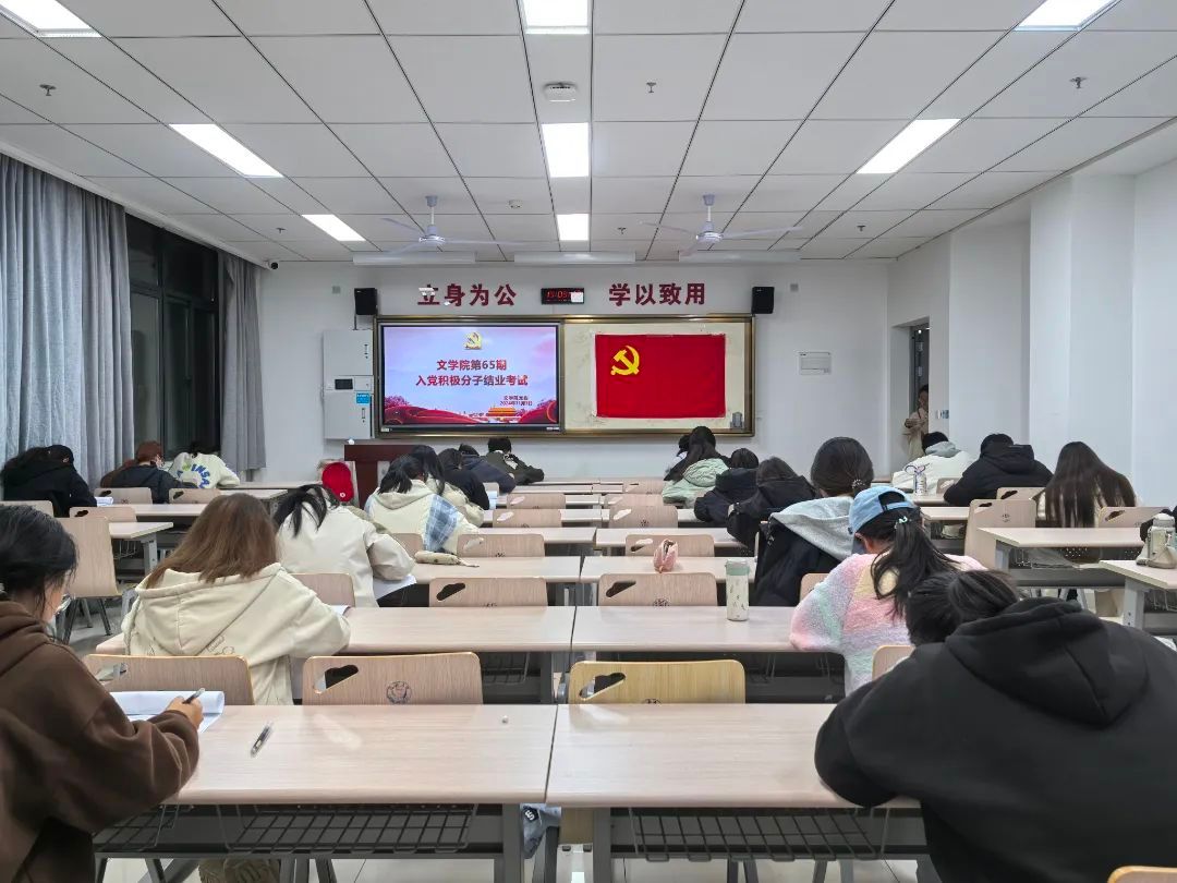 (本网讯)为深入学习习近平新时代中国特色社会主义思想,全面贯彻落实党的二十届三中全会精神,在党员发展工作中严把标准和程序关,高标准高质量抓实抓好入党积极分子的培训与考察工作,检验入党积极分子的理论学习成果,文学院党委于11月1日晚7点在文学楼102、104教室举行了第65期入党积极分子结业考试。